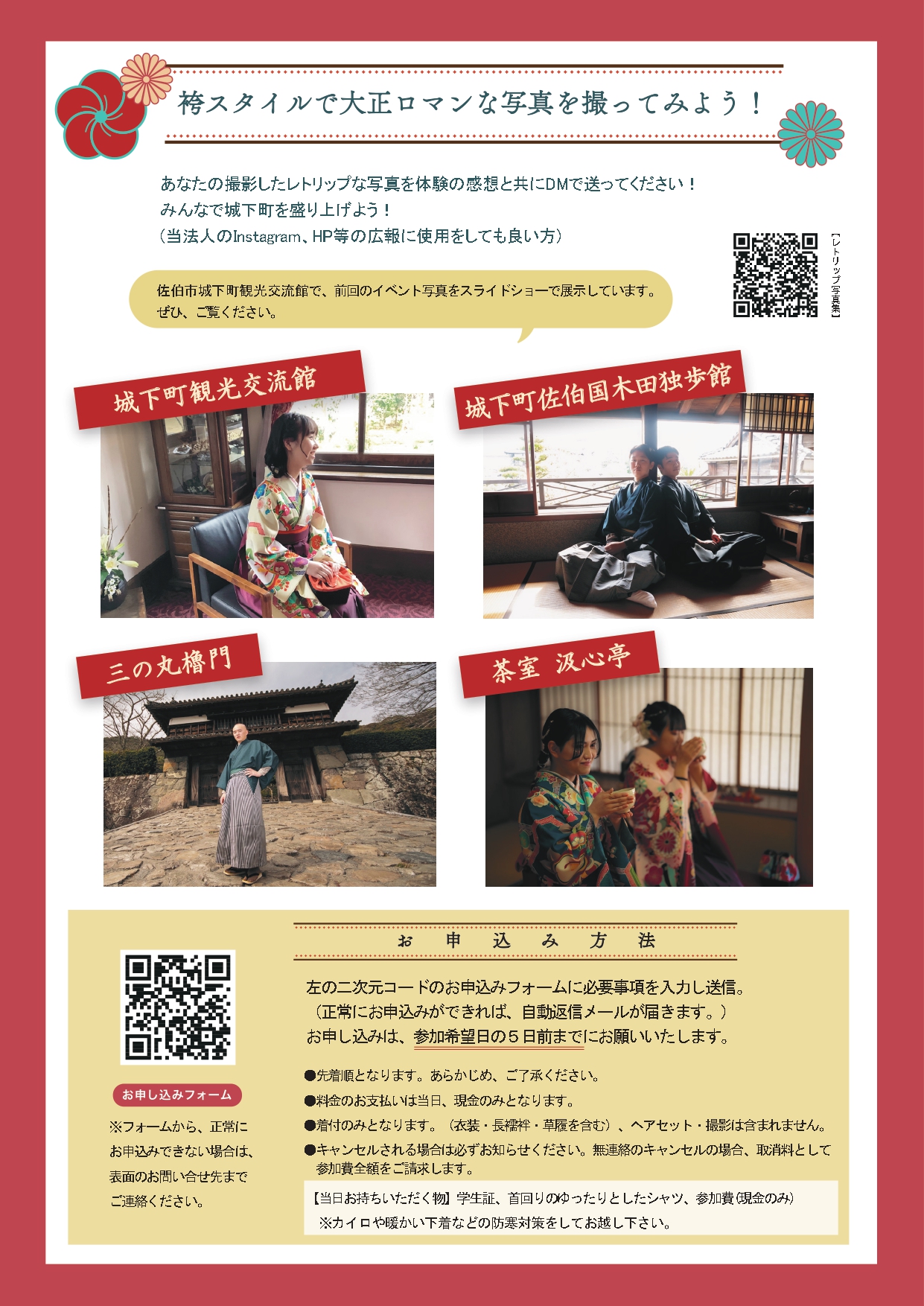 高校生の皆さんを対象に、大正ロマンをイメージした袴姿で城下町・佐伯を楽しんでいただく着付体験イベントです。