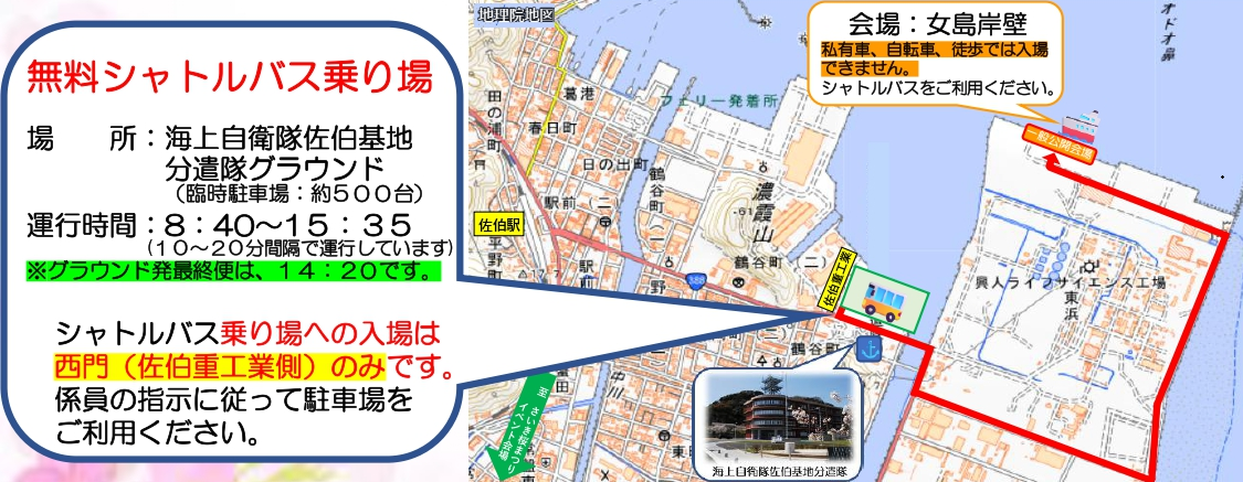 1. 艦艇一般公開会場への入場はシャトルバスのみです。
