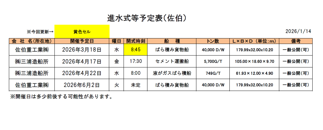 - 進水式に関しては表掲載の通りの予定ですが、急な変更の可能性もございますこと、