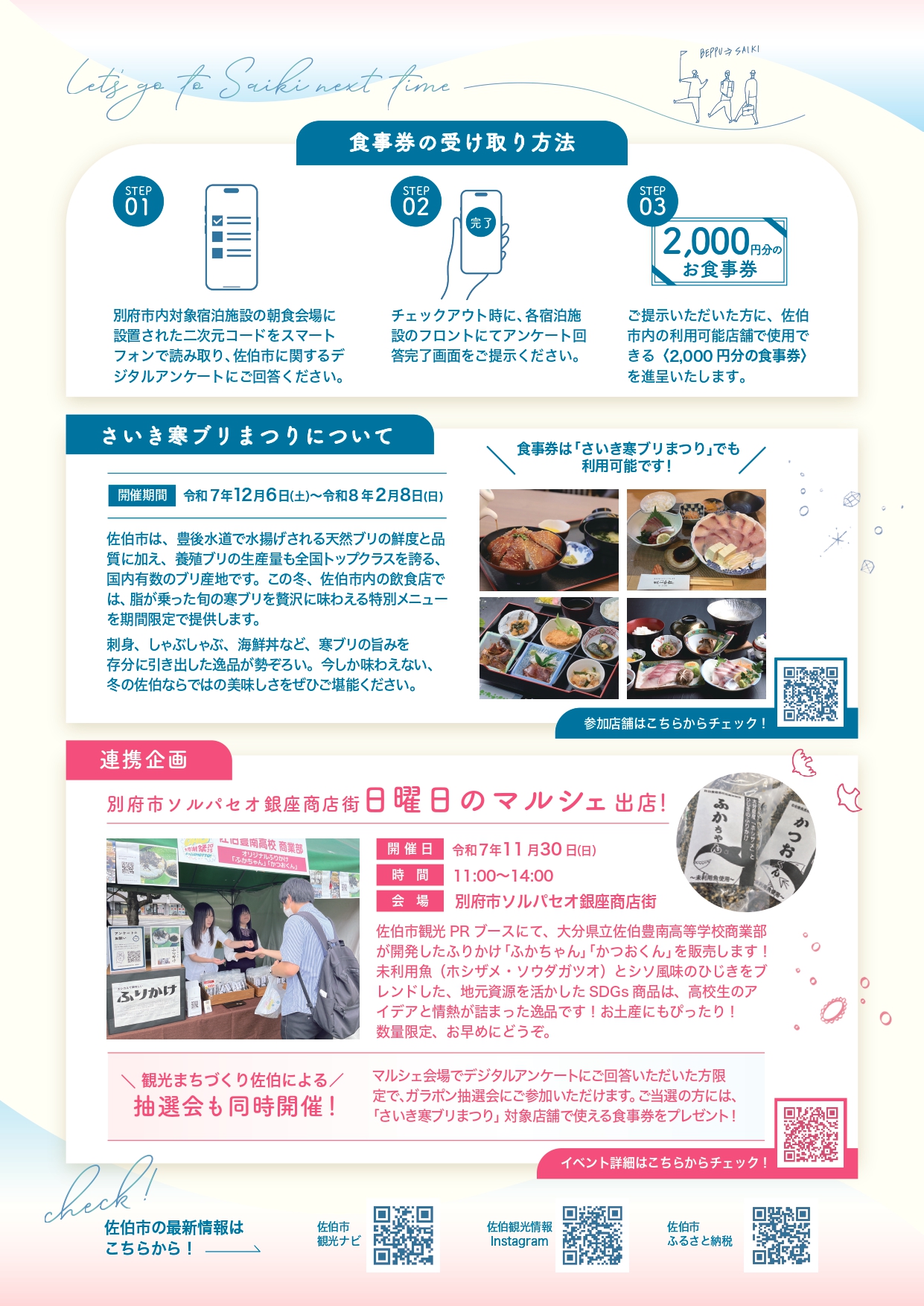 アンケートに答えることで、佐伯市「さいき寒ブリまつり」参加店舗で使える〈2,000円分の食事券〉をプレゼント!