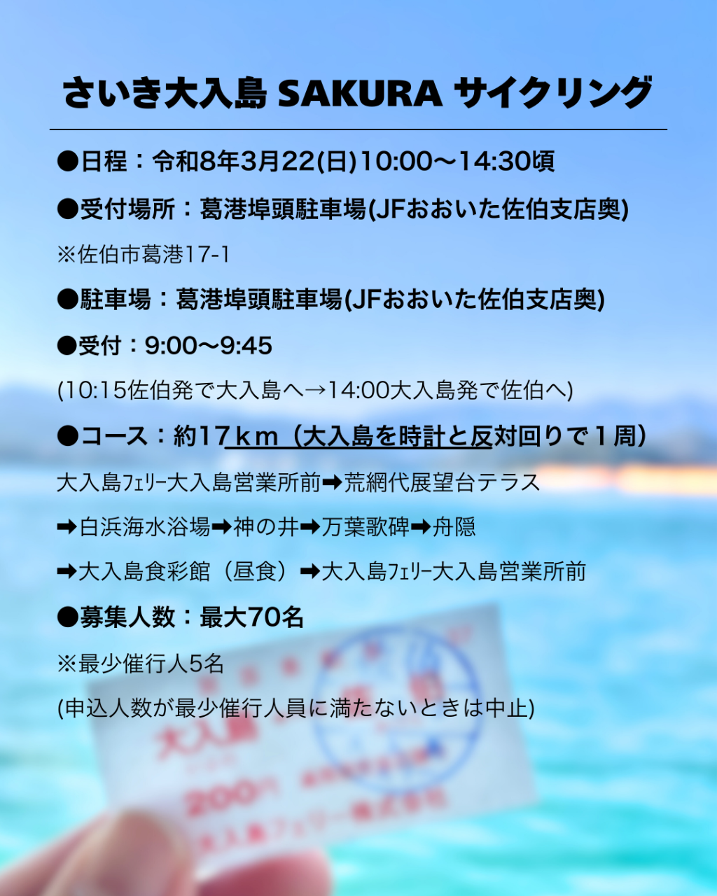 春の訪れを感じながら、桜咲く大入島をゆったりと巡るサイクリングイベントを開催します。