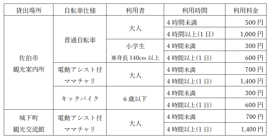 - 佐伯駅隣の「佐伯市観光案内所」には普通自転車・電動アシスト付ママチャリ・キックバイクをご用意しています。