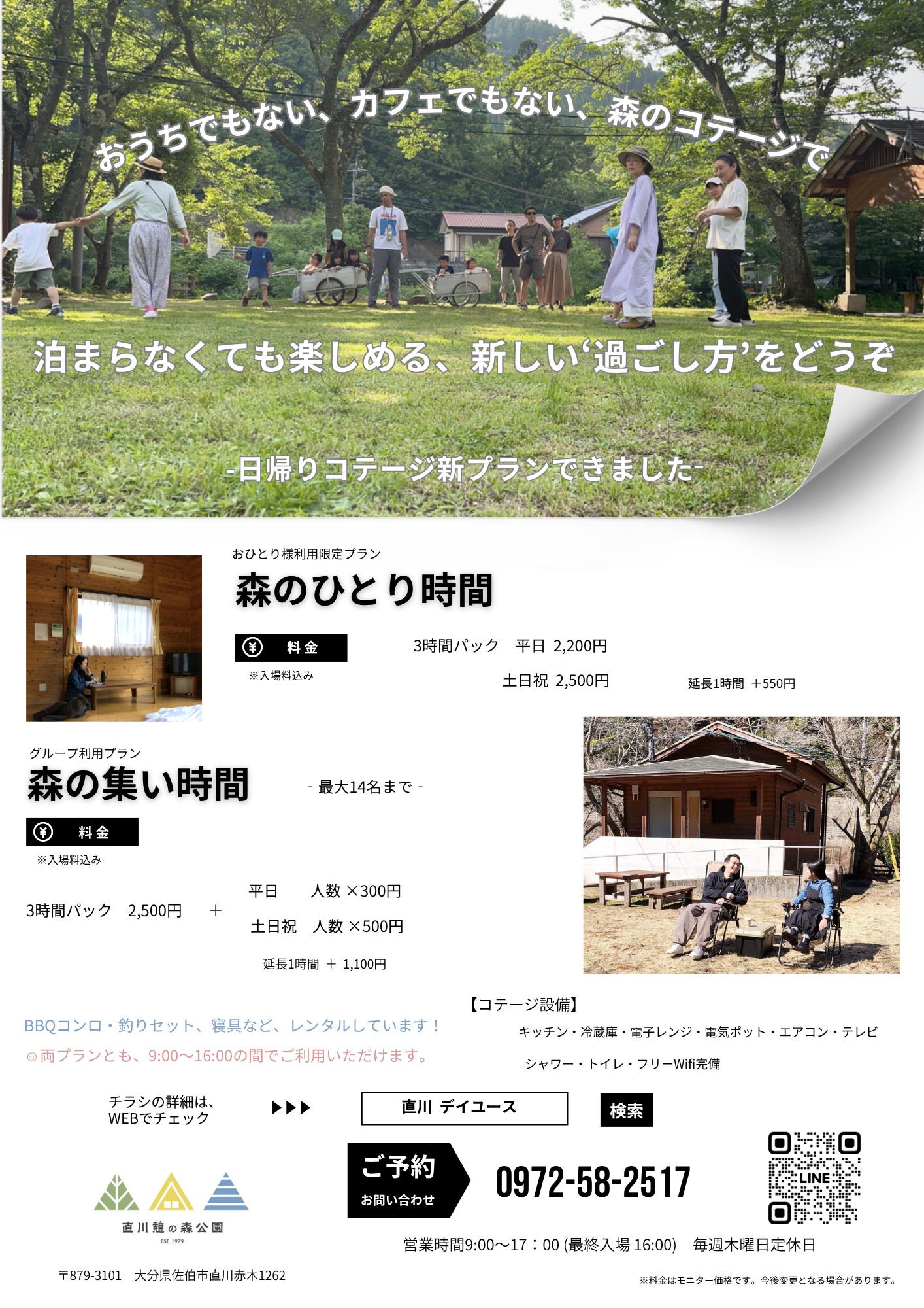 公式Webサイト: 直川憩の森公園キャンプ場(https://tabidoku.com/camp-naokawa/)。最新情報もこちらのWebサイトでご確認ください。