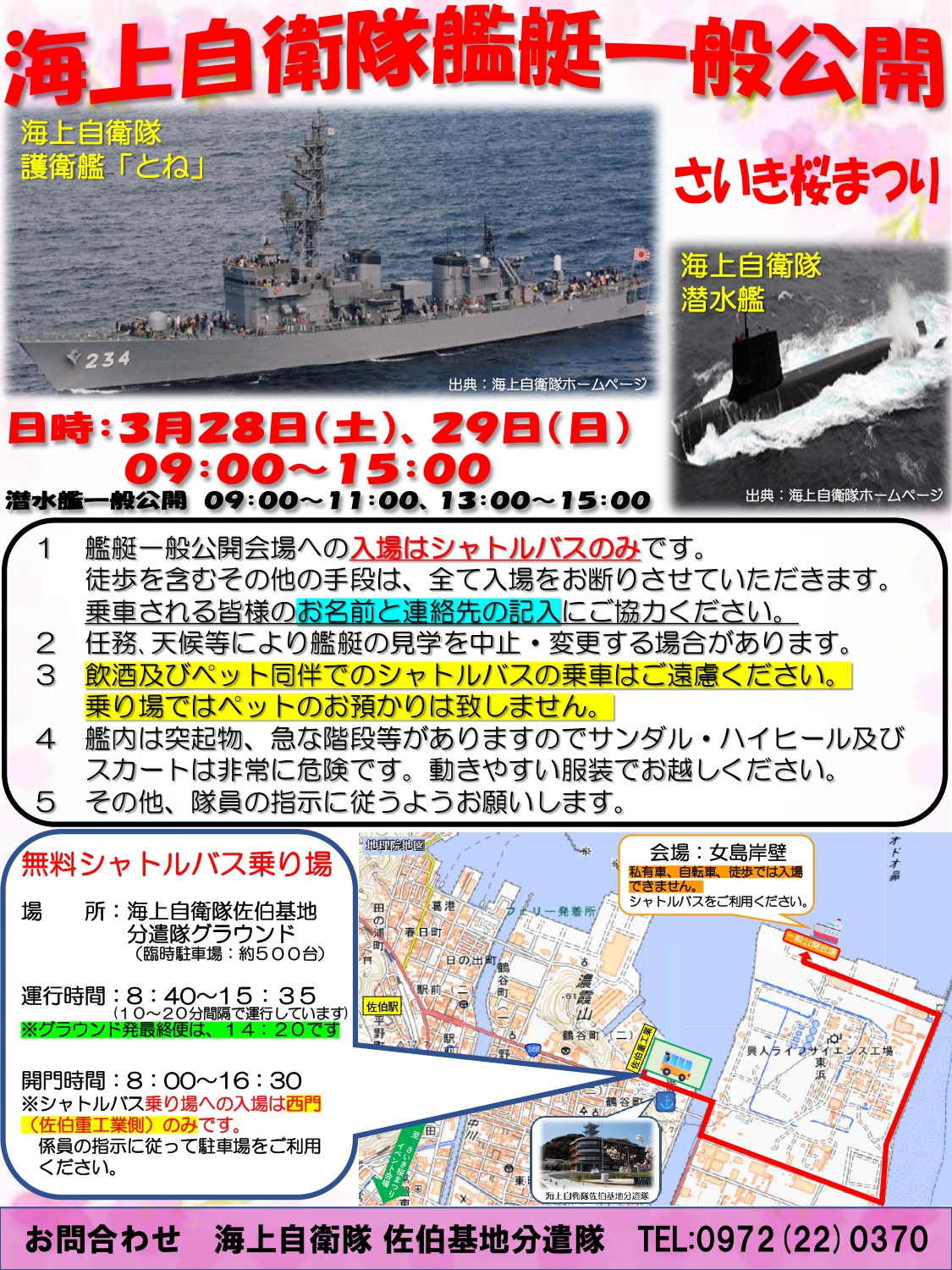 さいき桜まつりにあわせて、海上自衛隊 護衛艦とねと海上自衛隊 潜水艦の一般公開が行われます。