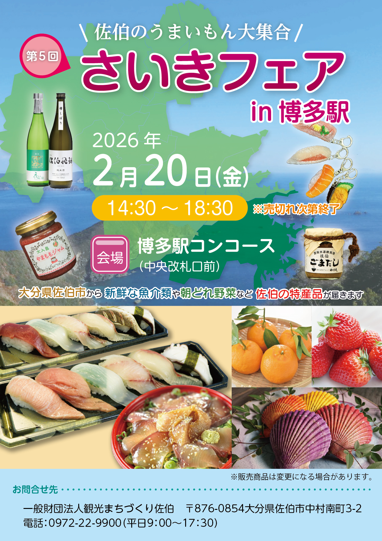 2026年2月20日(金)、JR博多駅コンコースにて、大分県佐伯市の特産品販売イベント「第5回さいきフェア in 博多駅」を開催します。