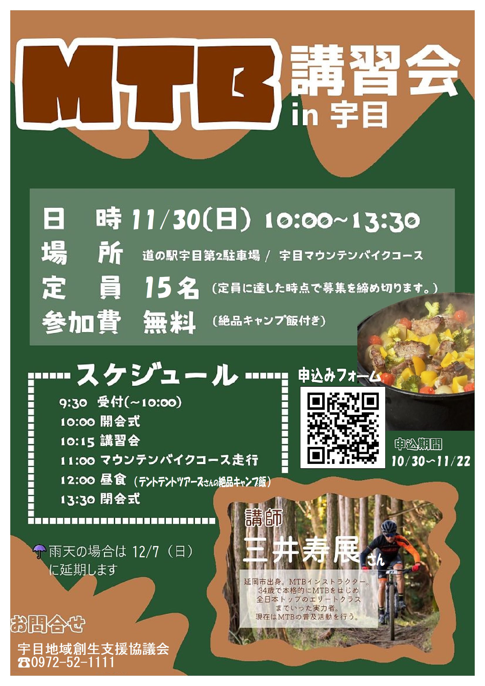 MTBのスペシャリスト三井寿展さんを講師に招き、MTB講習会in宇目を開催します。